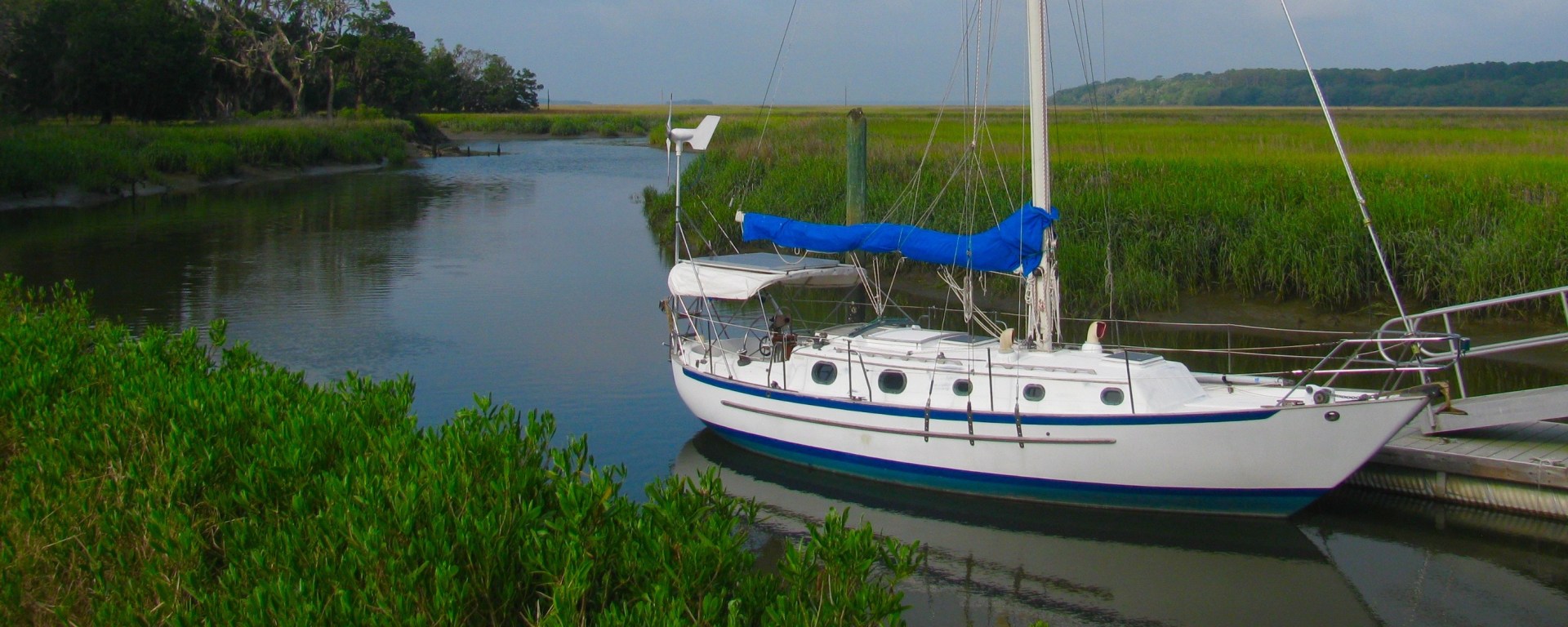 On the north end of the island overlooking Mud River are the remains of Chocolate Plantation, featuring the ruins and foundations of tabby slave houses and a huge tabby barn. The land was first occupied by a group of Frenchmen in the late 1700s who named it after Chucalate, a Guale Indian village on the island. Used primarily to grow cotton, the plantation was established in 1819 and had a number of owners over the years, including Spalding and Coffin. Next to it is a Sears Roebuck house purchased from a catalog and constructed from a kit that dates back to the 1930s.