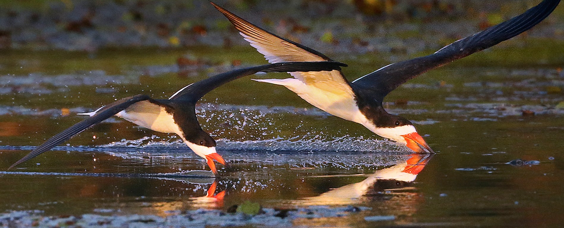 To a symphony of tweets, caws and chit-chit-chitters, black skimmers glide inches above the water, their lower bills dragging the surface to scoop up tiny fish. A pink spoonbill stands stock-still on the far edge of the pond, a single pink eye visible and unblinking. A trio of majestic wood storks swoops in and slowly stalks the shoreline while two male glossy ibises extend their reddish-black wings in battle. A dozen or so gull-billed terns zoom back and forth overhead, as an equal number of small gators silently motor through the water, waiting for prey.